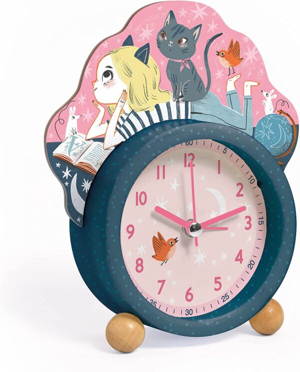 Una bella sveglia illustrata per svegliarsi dolcemente e imparare a leggere l’ora. Le lancette mostrano le ore, i minuti e i secondi con un silenzioso movimento al quarzo. Grazie al pulsante “luce”, il bambino può vedere l’ora al buio. Un bell’oggetto decorativo che permette al bambino di orientarsi nel tempo. Funziona con 1 pila LR6 (non inclusa).
