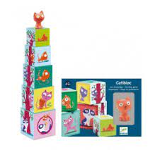 Cinque cubi cartonati impilabili splendidamente illustrati ed un gattino in gomma.