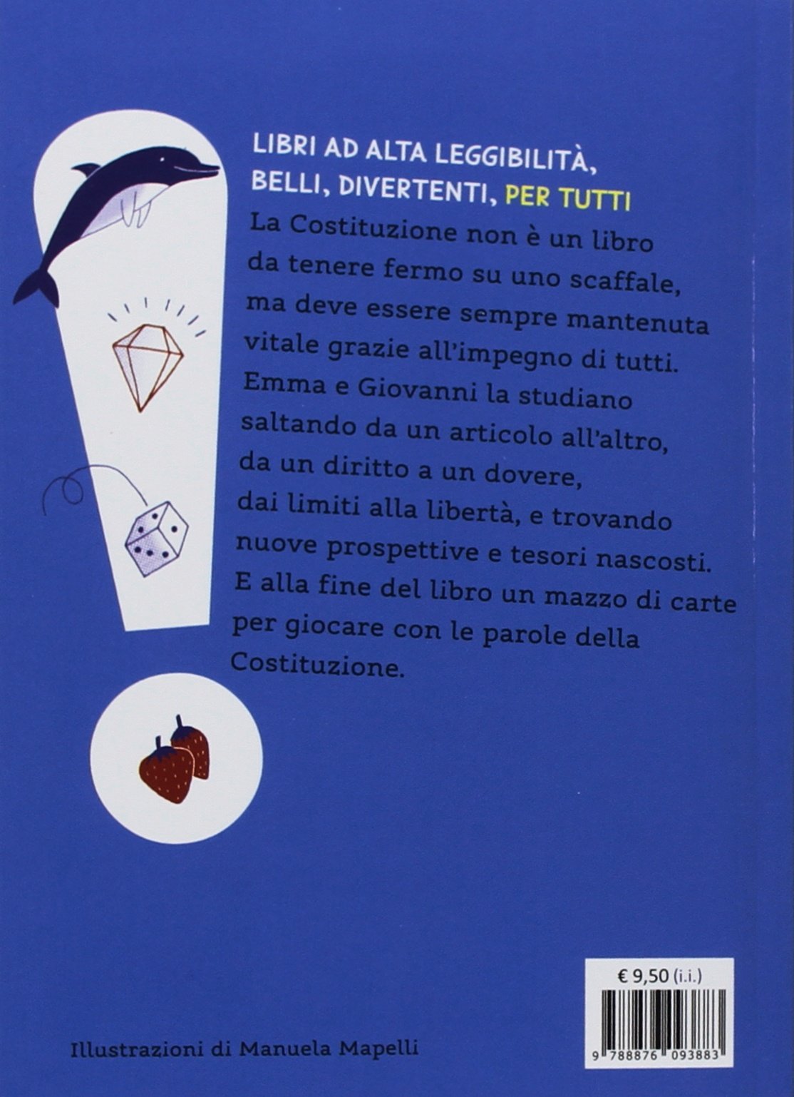 La Costituzione non è un libro da tenere fermo su uno scaffale, ma deve essere sempre mantenuta vitale grazie all’impegno di tutti. Emma e Giovanni la studiano saltando da un articolo all’altro, da un diritto a un dovere, dai limiti alla libertà, e trovando nuove prospettive e tesori nascosti. E alla fine del libro un mazzo di carte per giocare con le parole della Costituzione. Età di lettura: da 8 anni.