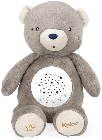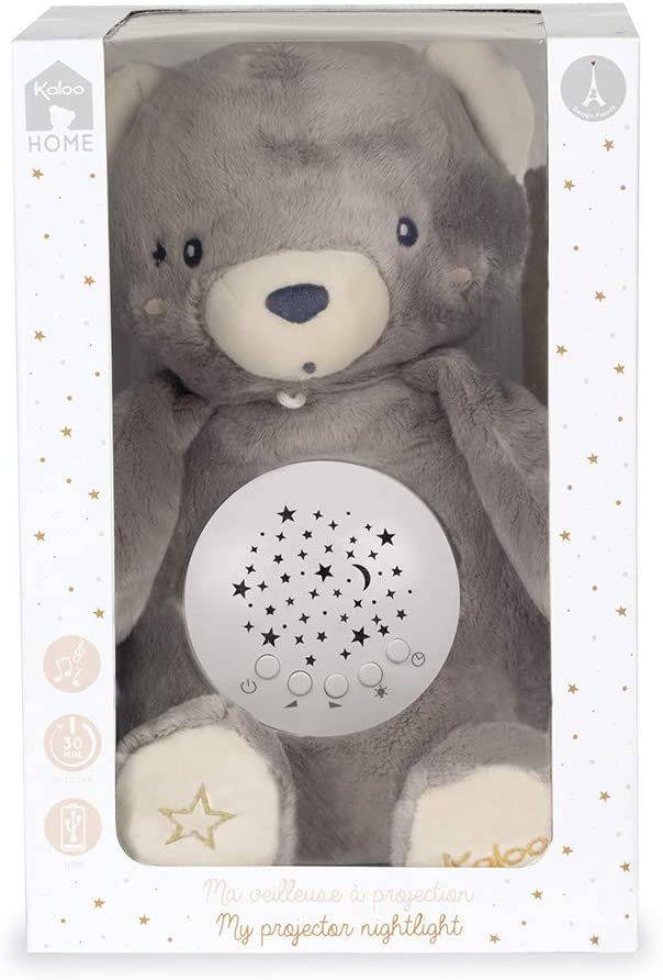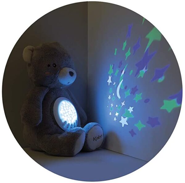 Il peluche accoglie nella sua pancia una scatola luminosa che, con un sottofondo musicale rilassante, proietta una polvere di stelle sulle pareti e sul soffitto della cameretta del bambino per aiutarlo ad addormentarsi.