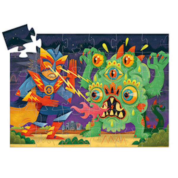 Laser Boy è un puzzle da 36 pezzi in cartone pressato, 6 in riga e 6 in colonna, che forma un quadro rettangolare di 42×30 cm.
