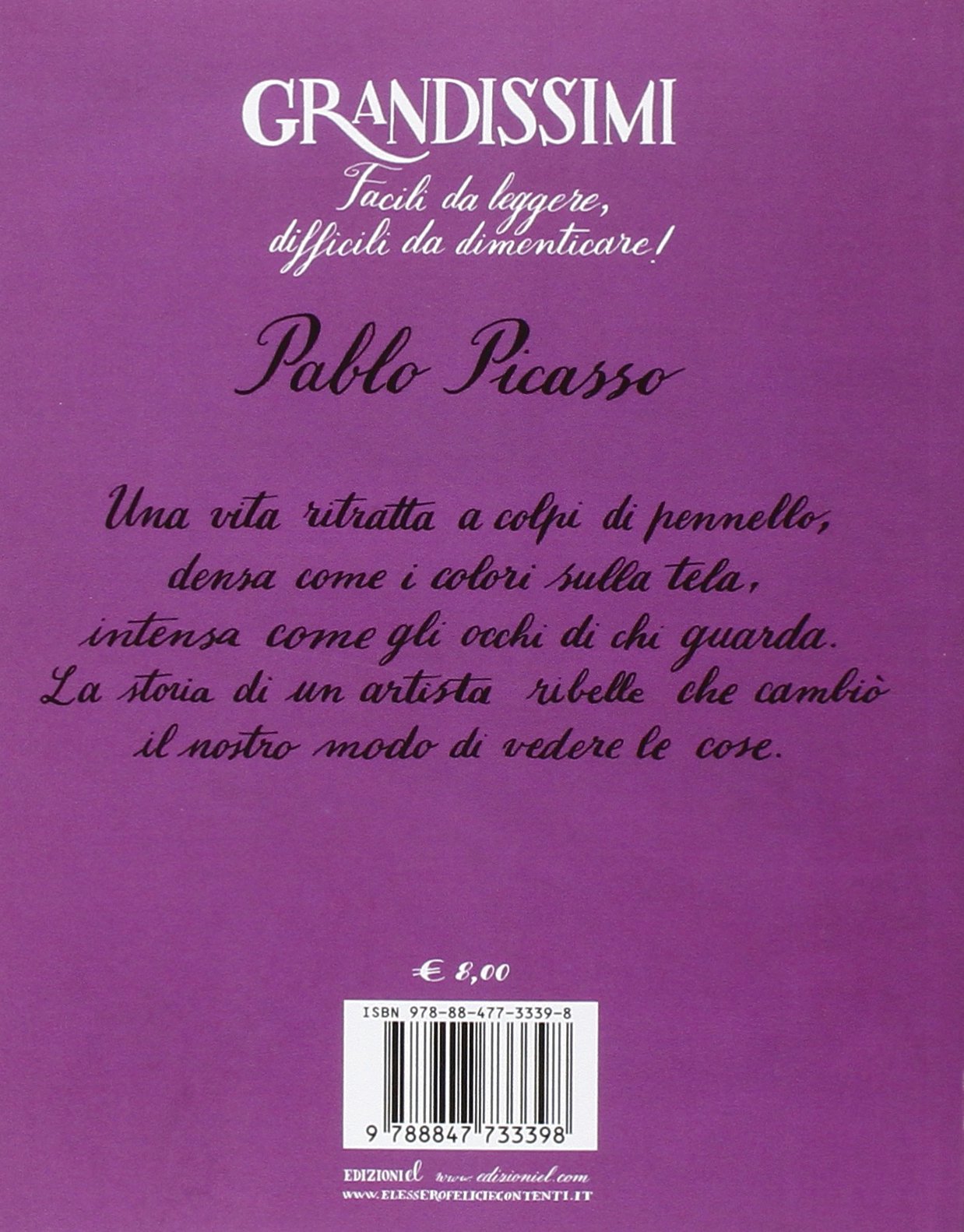 Il volume racconta un “grandissimo”, con la voce di un autore e la mano di un illustratore. Le ultime pagine del volume offrono una brevissima appendice con i luoghi o le opere legati al personaggio e sopravvissuti fino a noi: in questo modo, se e quando vorrà, il lettore potrà ripercorrere le tracce del suo beniamino, scoprendolo ancora più vicino. Perché a essere grandissimi si comincia da piccoli! In questo volume Pablo Picasso: una vita ritratta a colpi di pennello, densa come i colori sulla tela, intensa come gli occhi di chi guarda. La storia di un artista ribelle che cambiò il nostro modo di vedere le cose. Età di lettura: da 7 anni.