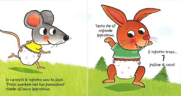 Topotto curioso va a guardare nei pannolini degli altri animali, e trova le cacche di diverse forme, e poi tocca a lui far vedere cos’ha nel suo pannolino.