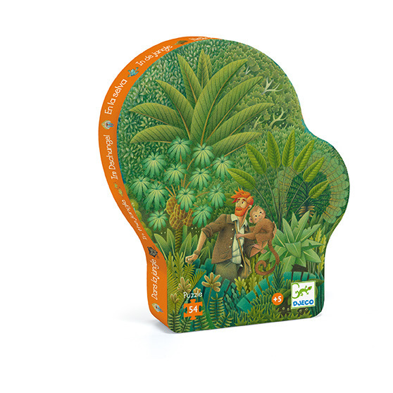 Un esploratore si aggira in una giungla piena di animali e piante tropicali. Un superbo puzzle di 54 pezzi in una bella scatola sagomata.