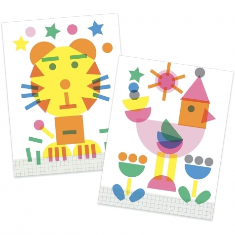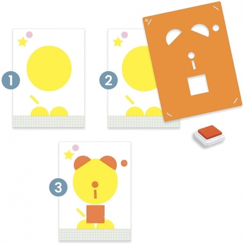 Per completare questi disegni, il bambino inserisce il foglio nelle tacche dello stencil, poi utilizza le spugnette, lascia le impronte e colora gli scenari proposti.