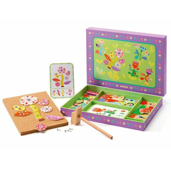Una nuova splendida idea di Djeco per giocare e divertirsi in modo originale, Tap Tap Garden diventerà senz’altro il gioco preferito dei tuoi bambini. In una pratica confezione troverai una base in sughero, una serie di elementi in legno, un martello in legno e dei chiodini. Segui le idee indicate dalle schede o lascia andare la fantasia e divertiti a comporre il tuo giardino incantato; potrai divertirti a creare infinite combinazioni grazie ai bellissimi elementi a disposizione e quando hai finito di giocare puoi riporre tutto ordinatamente nella scatola grazie ai pratici scomparti. Crea i fiori e le piante martellando le tessere in legno con i chiodini Tap Tap!